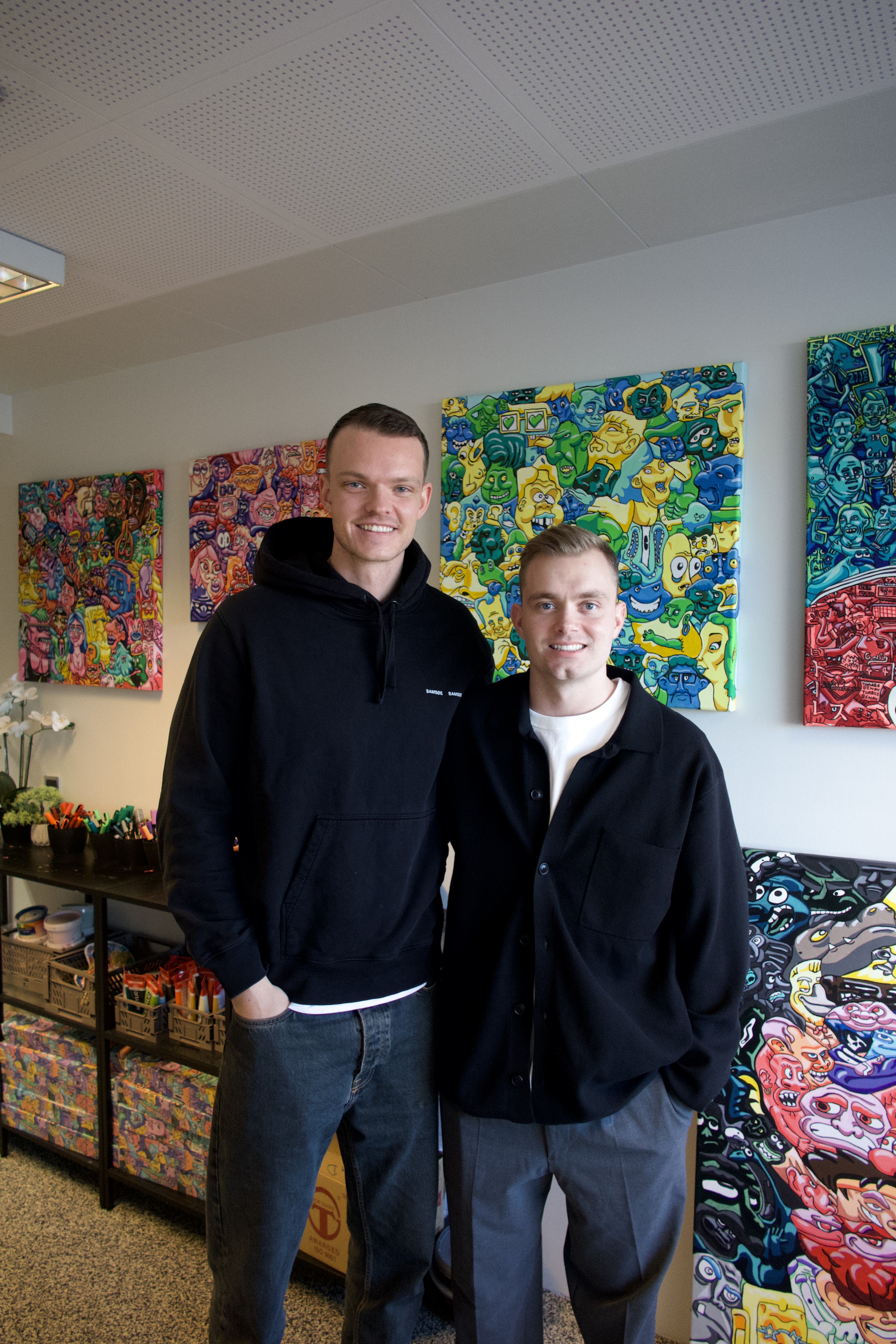 Guðjón Viðarsson Scheving og Kári Þór Arnarsson eru æskuvinir og listamenn sem hafa átt sköpunina sameiginlega frá barnsaldri. Þeir kynntust á leikskólaárunum í Hæðarbóli í Garðabæ og allt síðan hefur teikning, málun og leikgleði verið órjúfanlegur hluti af vináttunni. Undir nafninu Skripo skapa þeir saman á innsæisríkan og frjálsan hátt, þar sem samtal þeirra birtist beint á striganum. Þeir vinna oft á tvo striga í einu og skiptast á að bæta við fígúrur, form og smáatriði, án þess að ákveða fyrirfram hvernig verkið endar. Stundum byrjar annar á auga eða handlegg og hinn tekur við, sem skapar óvæntar tengingar og lifandi karaktera. Verk þeirra bera með sér hlýju, húmor og traust sem hefur mótast í gegnum langa vináttu – list sem sprettur úr samveru, forvitni og gleðinni við að skapa saman.