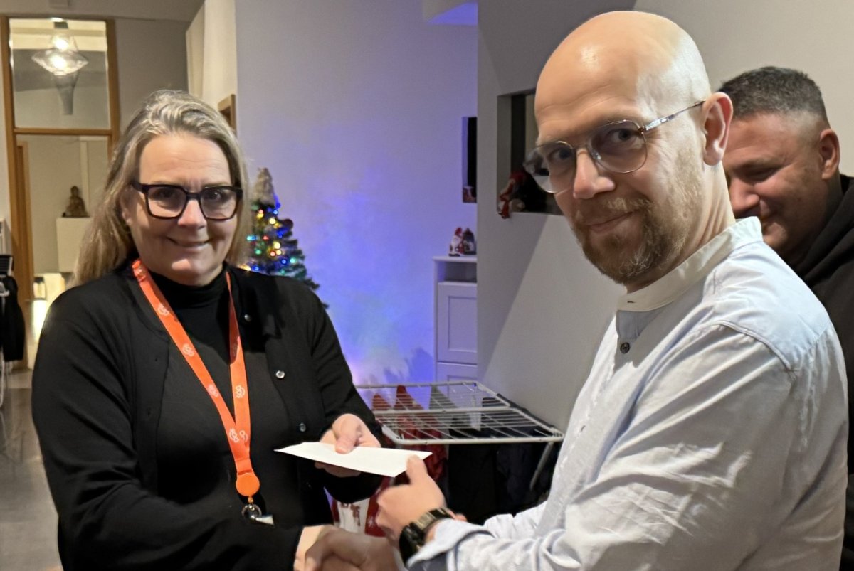 Á myndunum má sjá Önnu Hildi taka við peningunum úr hendi Helga Ólafssyni íbúa á Vin og svo nokkra vinarpilta ásamt Önnu Hildi og starfsfólkinu á Vin, þeim Bjarney og Reynari.